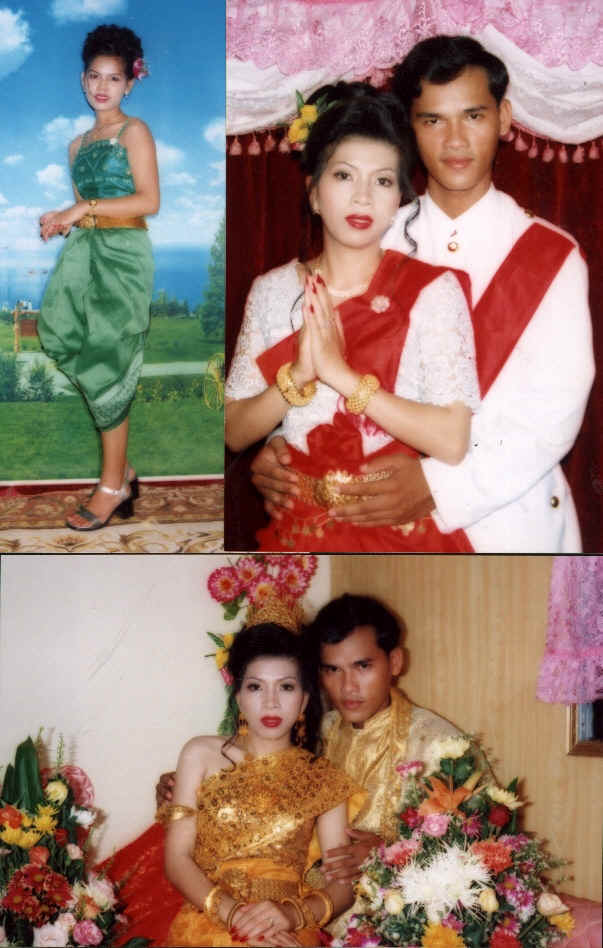 Clockwise from top left:� Sampot Chang Kben (skirt rolled in front and pulled up to waistband in back, common attire); Dressy attire including "temple sashes"; Royal and/or Wedding Attire.
